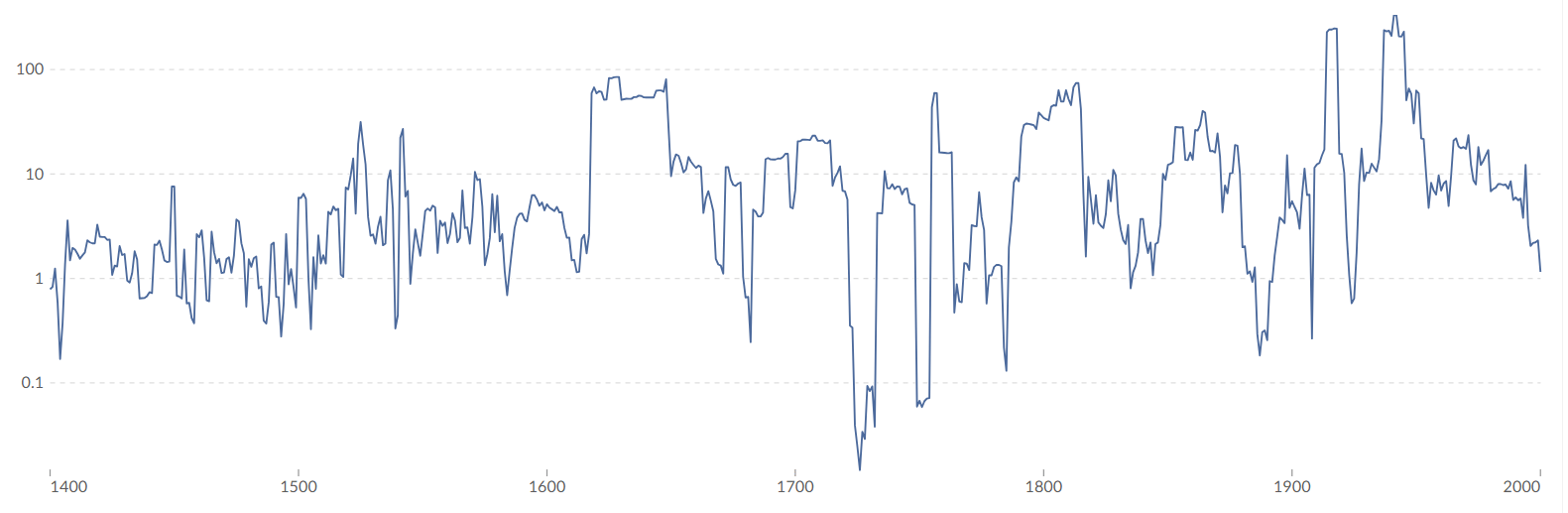 Lejos del pico más bajo en 1725, donde al parecer no hubo una sola guerra en todo el mundo, pero también lejos de 1941.