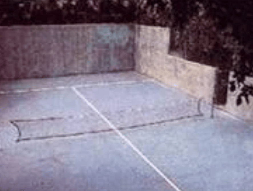 Imagen en hd de la primera pista de pádel del mundo, la de la casa de Corcuera. Los muros son de hormigón y la red, de tenis.