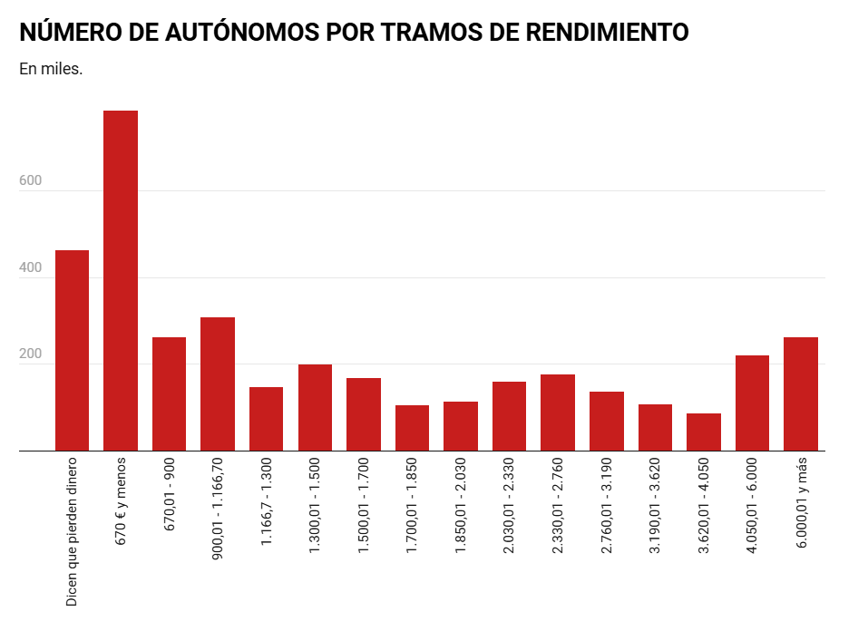 En España, la mayoría de autónomos ingresa 670€/mes o menos