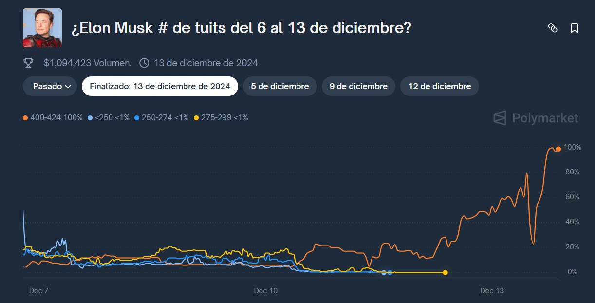Más de $1 millón movió esta predicción. ¿Los ganadores? Quienes apostaron a entre 400 y 424 tweets (un buen ritmo de 57 al día).