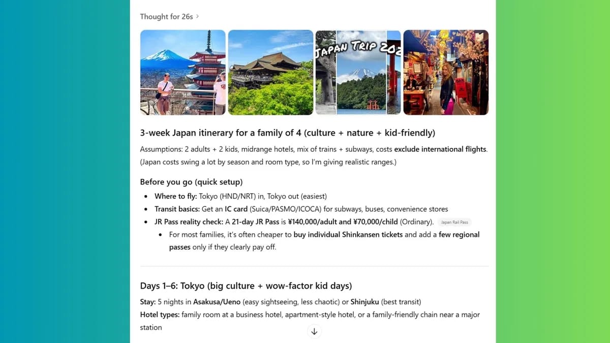 Planifica un viaje de 3 semanas a Japón para una familia de 4 personas con niños. Incluye información sobre cultura, naturaleza, actividades para niños, alojamiento, transporte y costos estimados.